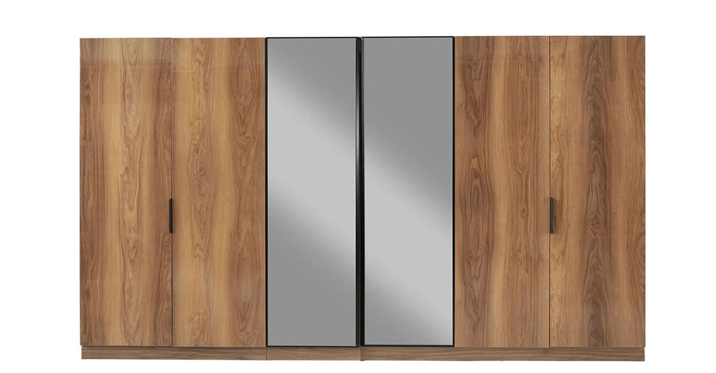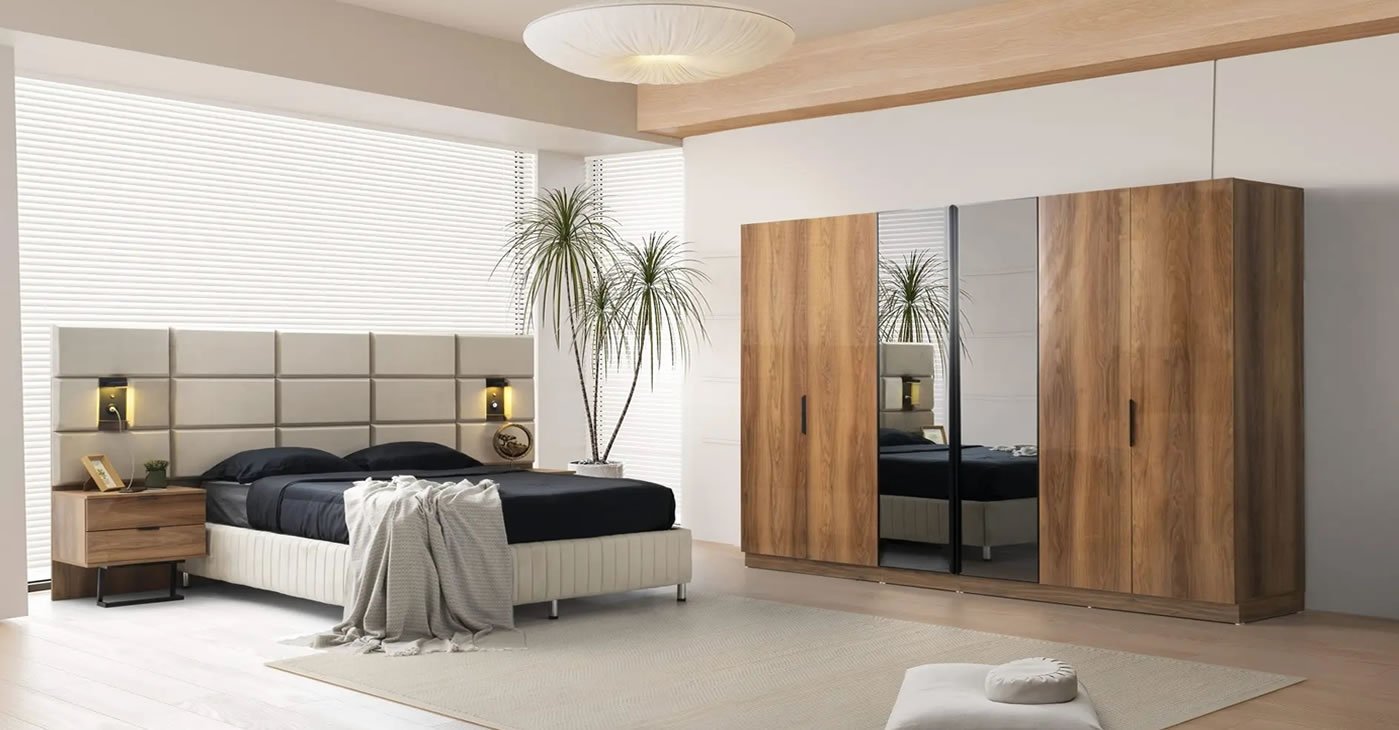Yatak odası takımımız köşe 6 kapılı gardırop olarak tasarlanmış olup %100 MDF'den üretilmiştir. Bağımsız modüler özelliği ile dolabınızın boyutunu istediğiniz gibi seçebilirsiniz. Modüllerimiz 3 kapılı dolap + köşe dolap + 2 kapılı dolap + 1 kapılı dolap şeklindedir. İsteğe göre modüller eklenebilir veya çıkarılabilir. Yatak odası kapakları membrandır. Dolap kapakları menteşeli frenlidir. Elbise askılarında LED ışıklar bulunmaktadır. Komodin üstündeki panelde ayna ve aplik ışık bulunmaktadır. Dolap aynalı kapaklarında yansıtıcı cam bulunmaktadır.