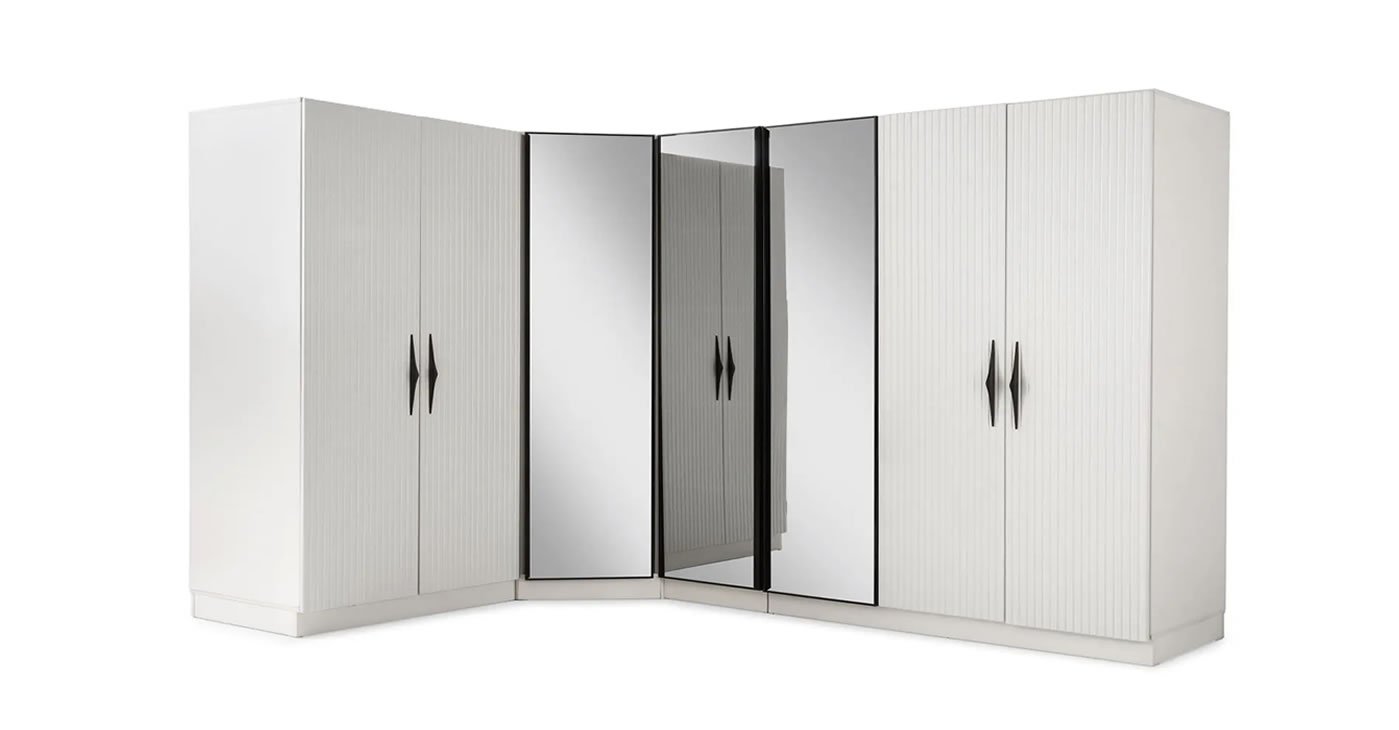 Yatak odası takımımız köşe L gardırop olarak tasarlanmış olup %100 MDF'den üretilmiştir. Bağımsız modüler özelliği ile dolabınızın boyutunu istediğiniz gibi seçebilirsiniz. Modüllerimiz 3 kapaklı dolap + köşe dolap + 2 kapaklı dolap + 1 kapaklı dolap şeklindedir. İsteğe göre modüller eklenebilir veya çıkarılabilir. Yatak odası kapakları membrandır. Dolap kapakları menteşeli frenlidir. Elbise askılarında LED ışıklar bulunmaktadır. Komodin üstündeki panelde ayna ve aplik ışık bulunmaktadır. Dolap aynalı kapaklarında yansıtıcı cam bulunmaktadır.
